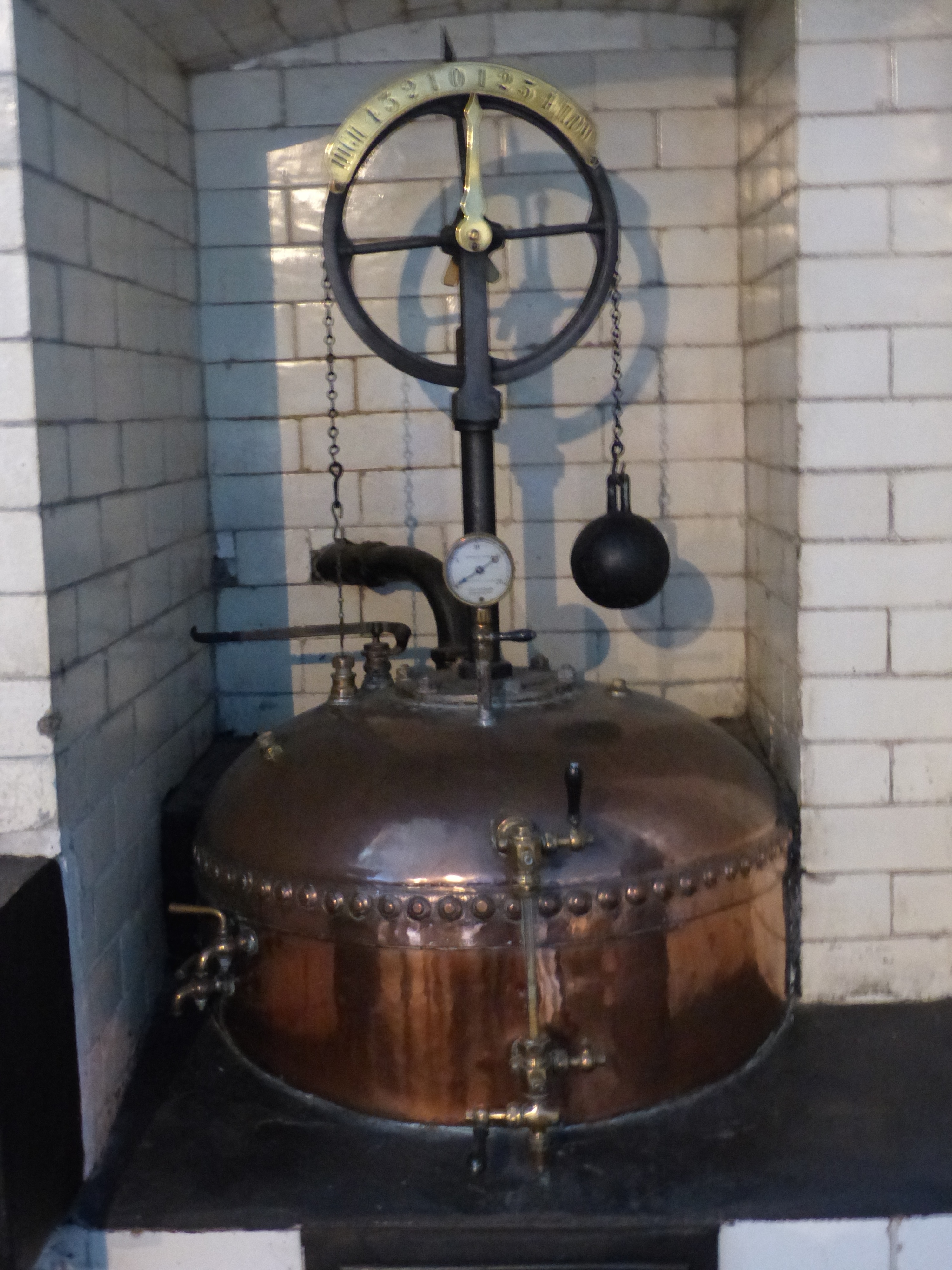On to the kitchen, where we were greeted by a large, jolly kitchen maid who began to tell us about the amazing technology used in that room. It was quite amazing, considering the age of the house, parts of which dated from the 16th century. The pride and joy was an enormous pressure cooker which, she told us, was one of only two remaining in the world, still intact. The gauge would be set and the water boiled to create steam, which would heat to a temperature according to the setting on the gauge. This would then be forced into other pipes, which would be used to work a series of separate pressure cookers, to prepare food. It was quite an ingenious design.