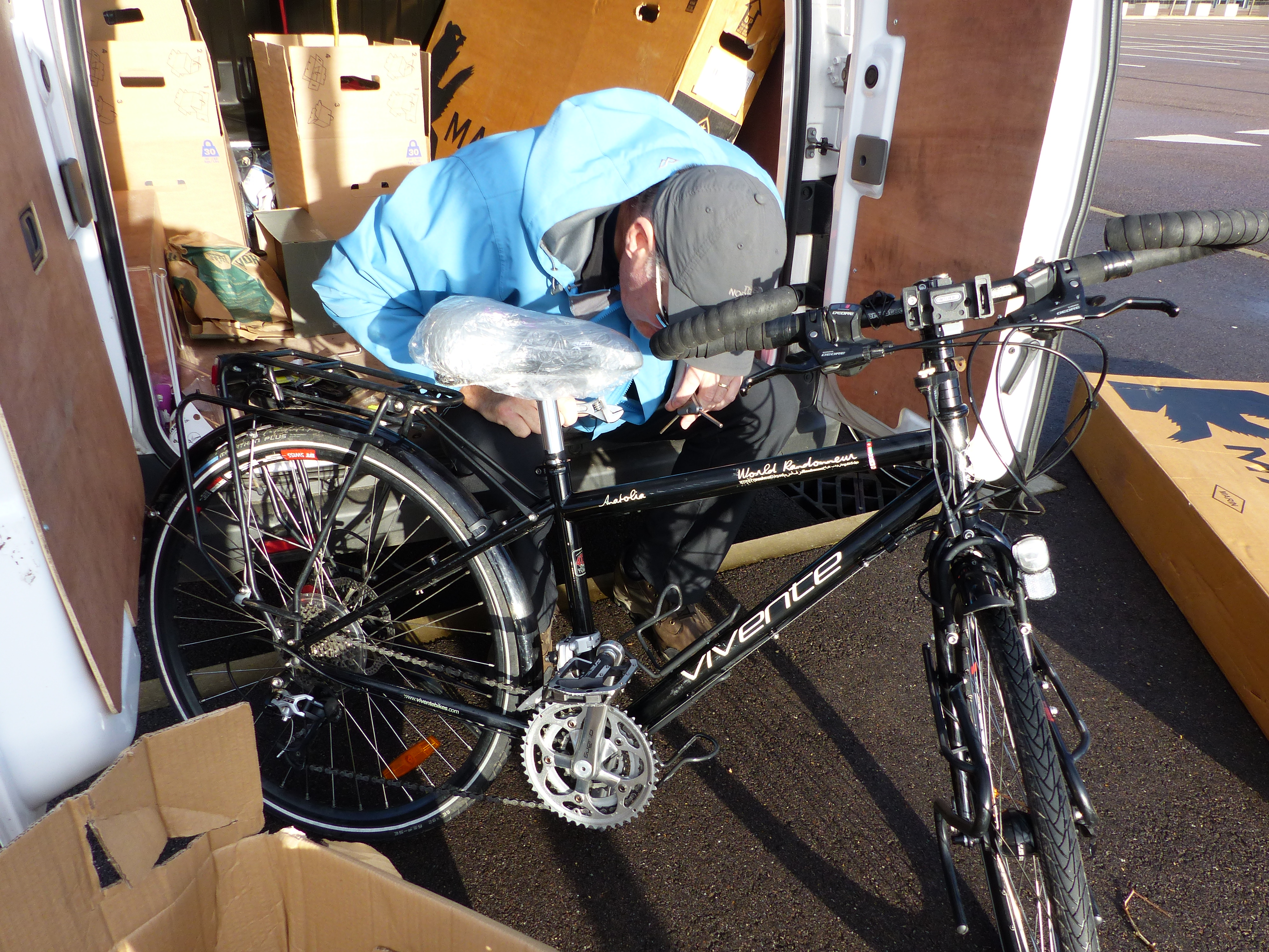 Steve armed himself with alan keys and bike tools and set about removing wheels and other parts. The removal of the pedals on his bike took some work and resulted in some grunts and growls and terse words. In the end it took him holding the alan key while I stood on it, to get the reluctant screw to turn and get the darn pedal off. Eventually, the bikes were robbed of the necessary parts to get them to fit into the boxes.