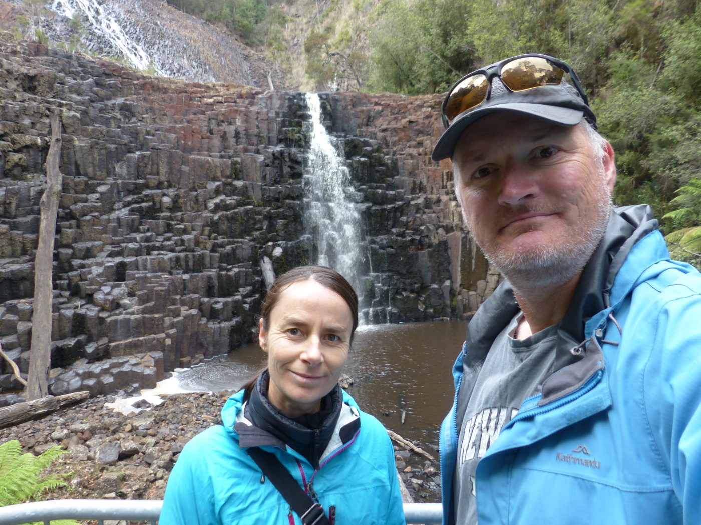 A short drive down the road and we parked for another short stroll down to the bottom of Dip Falls. Before we started the walk though we had to…don the raincoats. Yep, Ira the blue coat was back in action because of course, we had arrived, so it rained!