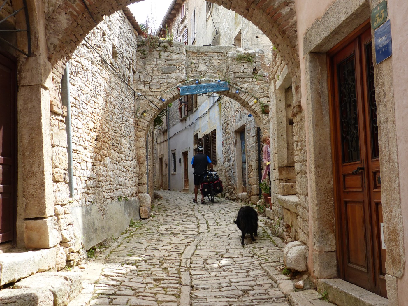 We set off from Pula this morning and the weather forecast said rain but thankfully, apart from a few spatters through the night, the morning was clear and not a drop to be seen. As we were leaving the apartment we were carrying all our panniers down two floors of narrow stone steps and I had two panniers in each hand and the rack pack bag and handlebar bag slung over my shoulder. I was making my way down when a man came out of one of the apartments a few stairs down, so I stopped to let him go ahead rather than hold him up with my slow one-step-at-a-time descent with the load in and over my arms. The man stopped and pointed to the panniers and said something, as if he was asking to take them. I didn’t want to be a bother and not having the language to say anything other than English, simply said, “It’s OK, thank you.”