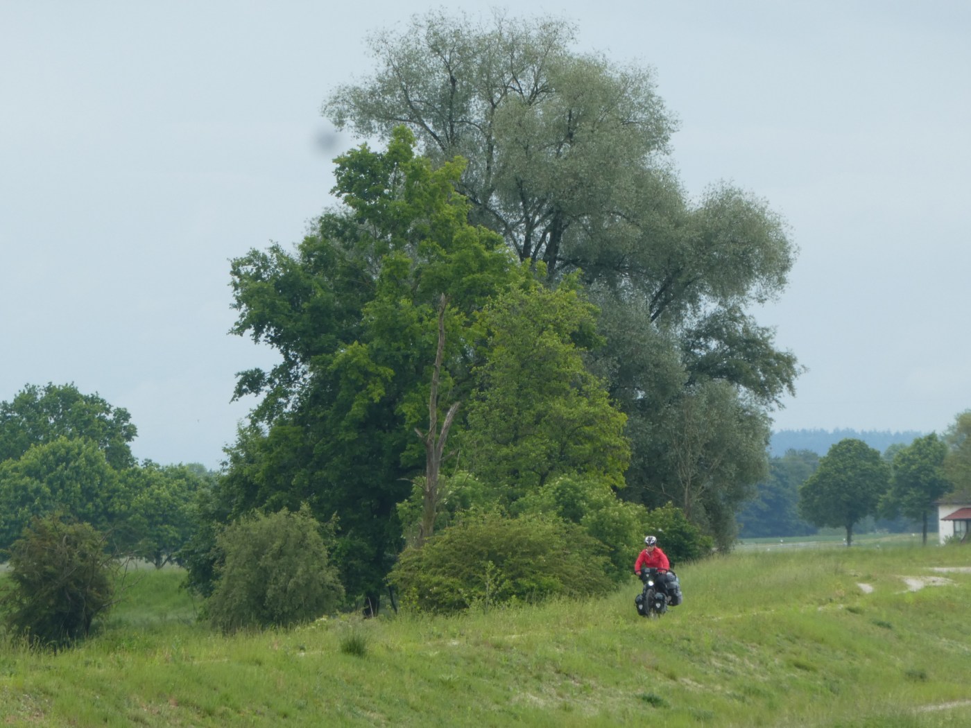 The path was unsealed, so gravel and puddles and some mud, but good enough to wheel along without too much difficulty. We were on the bank up above the river, which was good, because the rain had filled the river even more and it had spread itself over the ground around it yet again. We were well away from it though, so pedalled along, stopping to help another cyclist from the U.S. with directions. He was on his way to the ferry that we’d caught yesterday, so we could let him know he was going the right way. “That’s good,” he said, “Google has been sending me around in circles!”