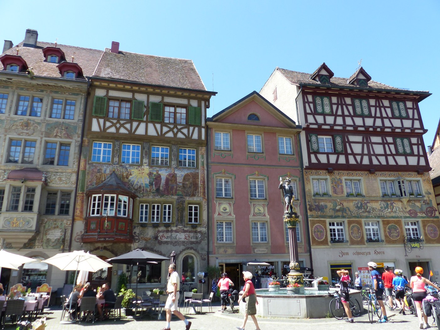 The path took us right and over a bridge and we saw the outer edge of the town of Stein am Rhein. Once over the bridge, we walked the bikes into the town, along its cobbles and into the main street. WOW! I mean..WOWZERS! That was the first thing that came into my head. This little town is UN-BEE-LEE-VABLE! Not only is it pretty and historic, but… those buildings! All down the main square and the cobbled street was building after building with a frontage covered in frescos. It was simply, well…hard to describe really, but…I guess I’d just have to say…stunning! Breathtaking even. Stein am Rhein is one of the best preserved medieval towns in Switzerland and it was like nothing I’d seen before. The cobbled, historic feel of the town was lovely in itself, but those buildings…I just stopped and stared and then walked the length of the street, just amazed by them. It was a very special little place.