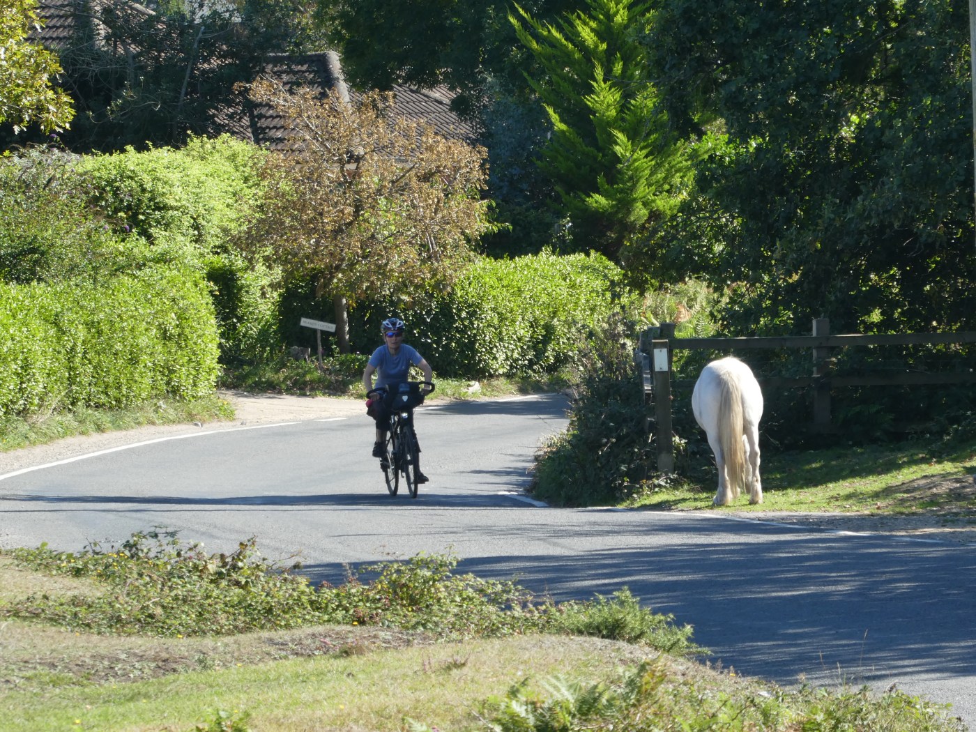 We had another section of road to navigate and this was busy, not just with four wheeled traffic but with the two-wheelers as well. Group after group of cyclists rode by, all with numbers on their bikes or jerseys. Some sort of organised event was obviously taking place, because we were pedalling amongst a sea of lycra. It was great to see the competitors though, making up every possible age, shape and size of person. It wasn’t just flash, lithe cycling pros out there, there were people our age and older, with and without round bits and wobbly bits like us, all squeezed into lycra and smiling or chatting with those around them as they wheeled along. Peloton after peloton of happy wheelers, getting involved in a pretty major event by the look of it, lots of grey hair under helmets, lots of people easily in their seventies, as well as youngsters and size was clearly no barrier, because there was every shape out there, getting active, being social and having fun. Brilliant!  We exchanged greetings again and even though they were clearly in some sort of competitive ride, we had continual smiles and waves from them as they went past. We later discovered it was The New Forest Sportive, with a 100 mile distance and other shorter distances, but there were heaps of people involved. Good on ‘em!