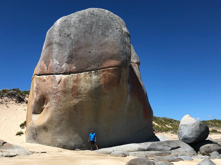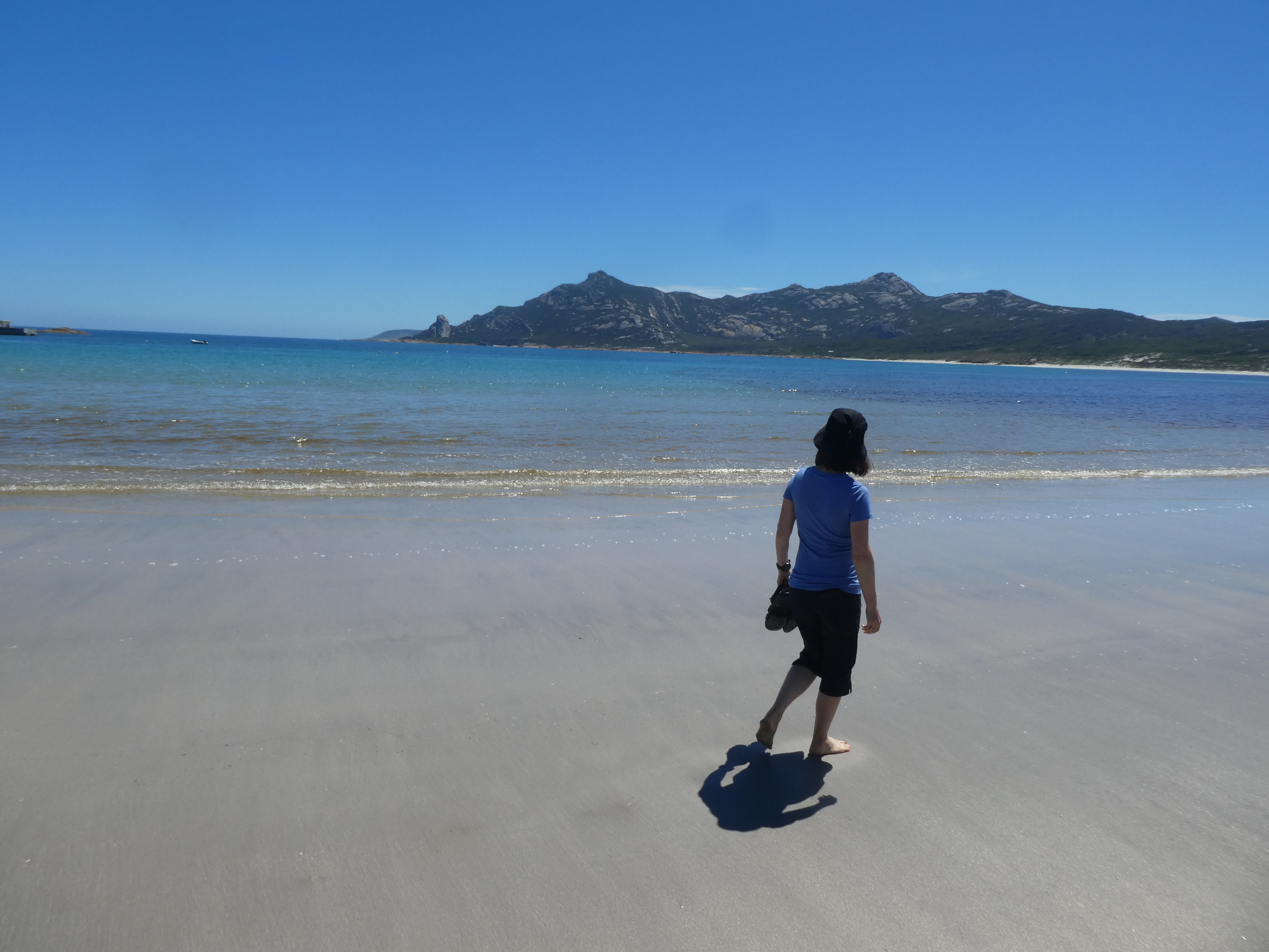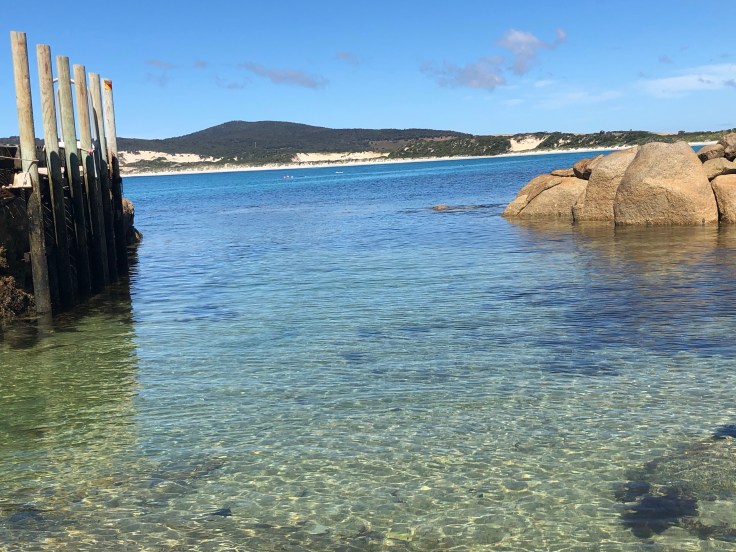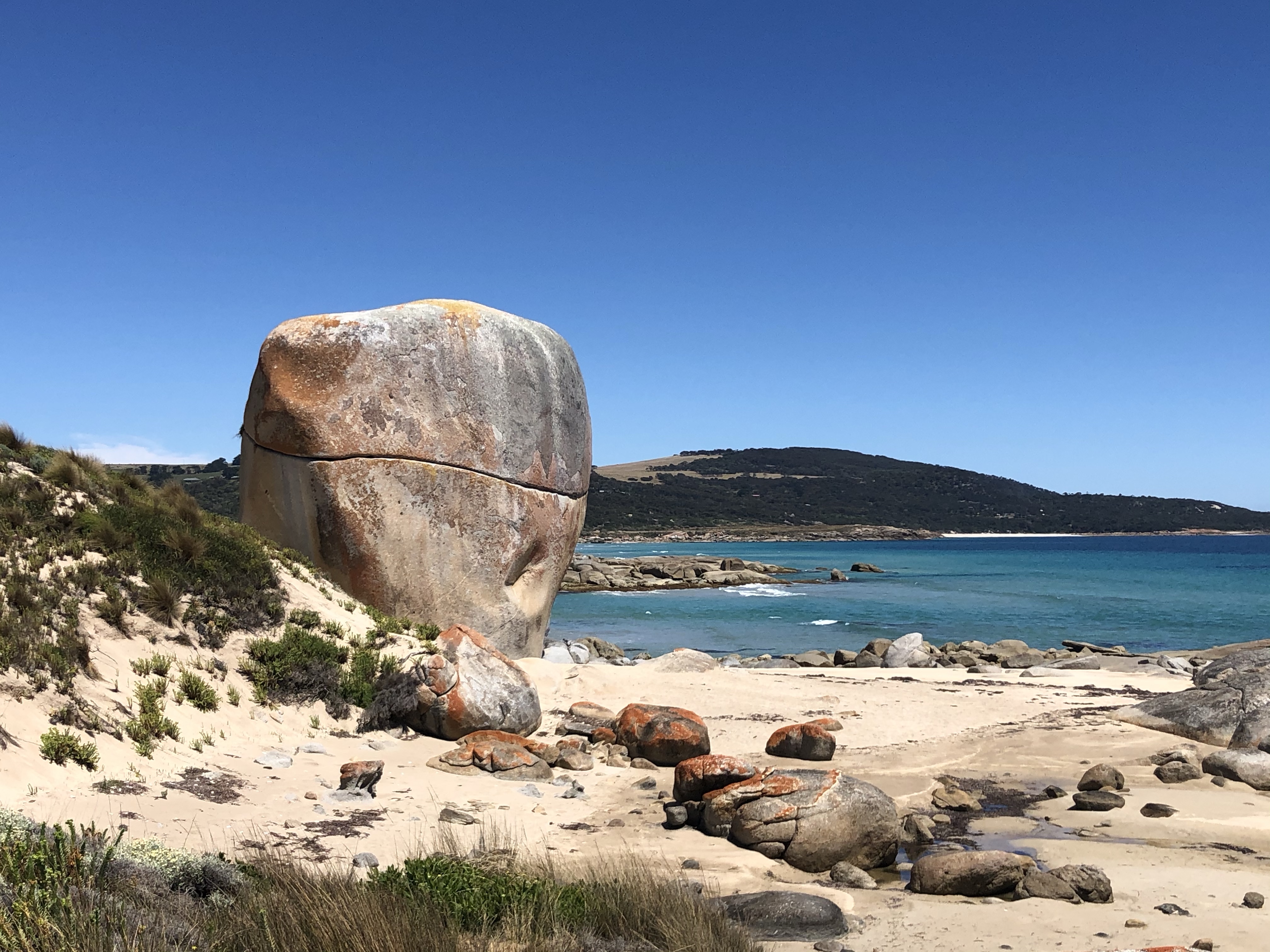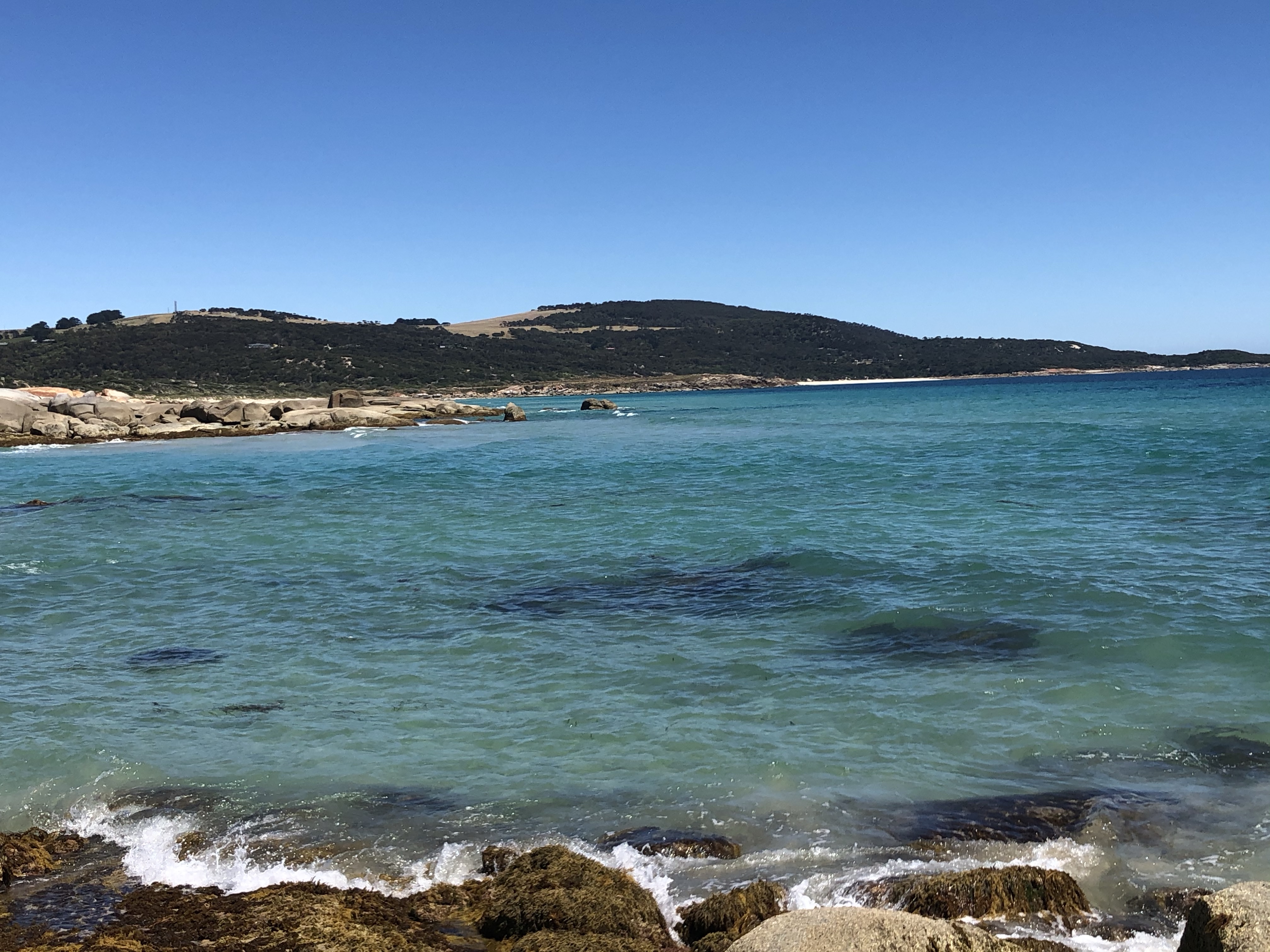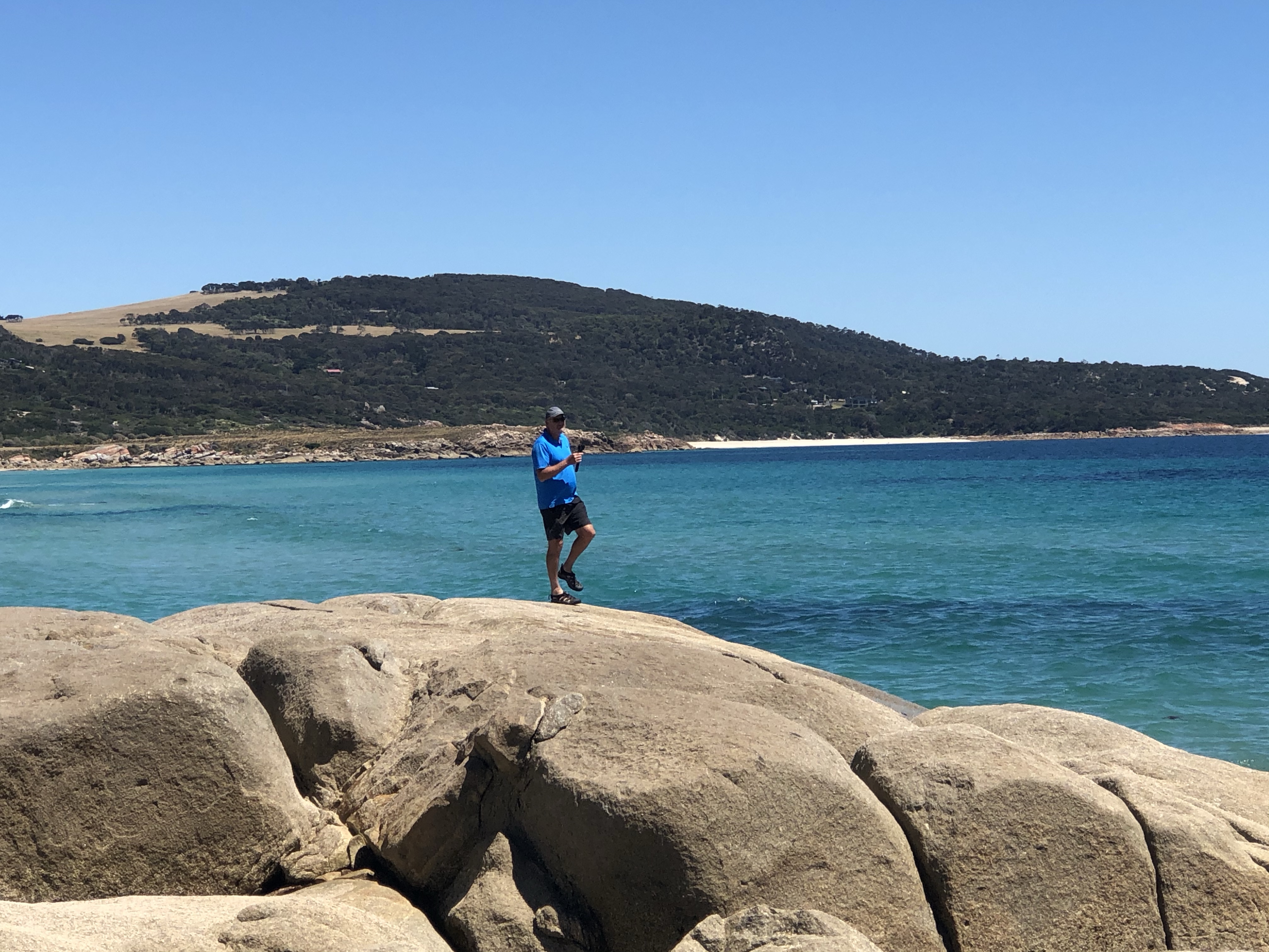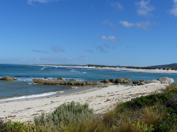 After seeing the speccy coast and beaches around Palana, the next day we decided to head for the spot on Flinders which is THE holiday spot. This is where locals have a shack or go for a holiday at the beach. If there was going to be a crowded beach, this would be it, but we figured we’d better go and see the place that had the pulling power for locals and visitors alike. Off we choofed to Killiecrankie. On the way though, we called in to Sawyers Beach, another fabulous, quiet, deserted, but top spot, with a long white beach, clear as crystal water and granite boulders dotted around.