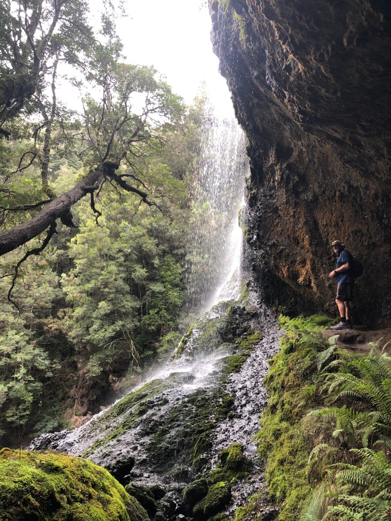 Along the track, a scramble here and a trudge there, a wrong turn once, before finding our way back to the markers and we could see Bridal Veil Falls, passing some very colourful and interesting fungi and lichen along the way. We walked up the bank and you could actually walk behind the falls, stand in the rock overhang and look out through the falling water. That was pretty cool. We stopped, sat on a rock and had a snack, looking out through the “bridal veil” of the water raining down. Lovely.