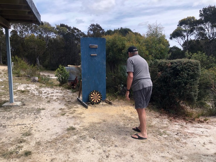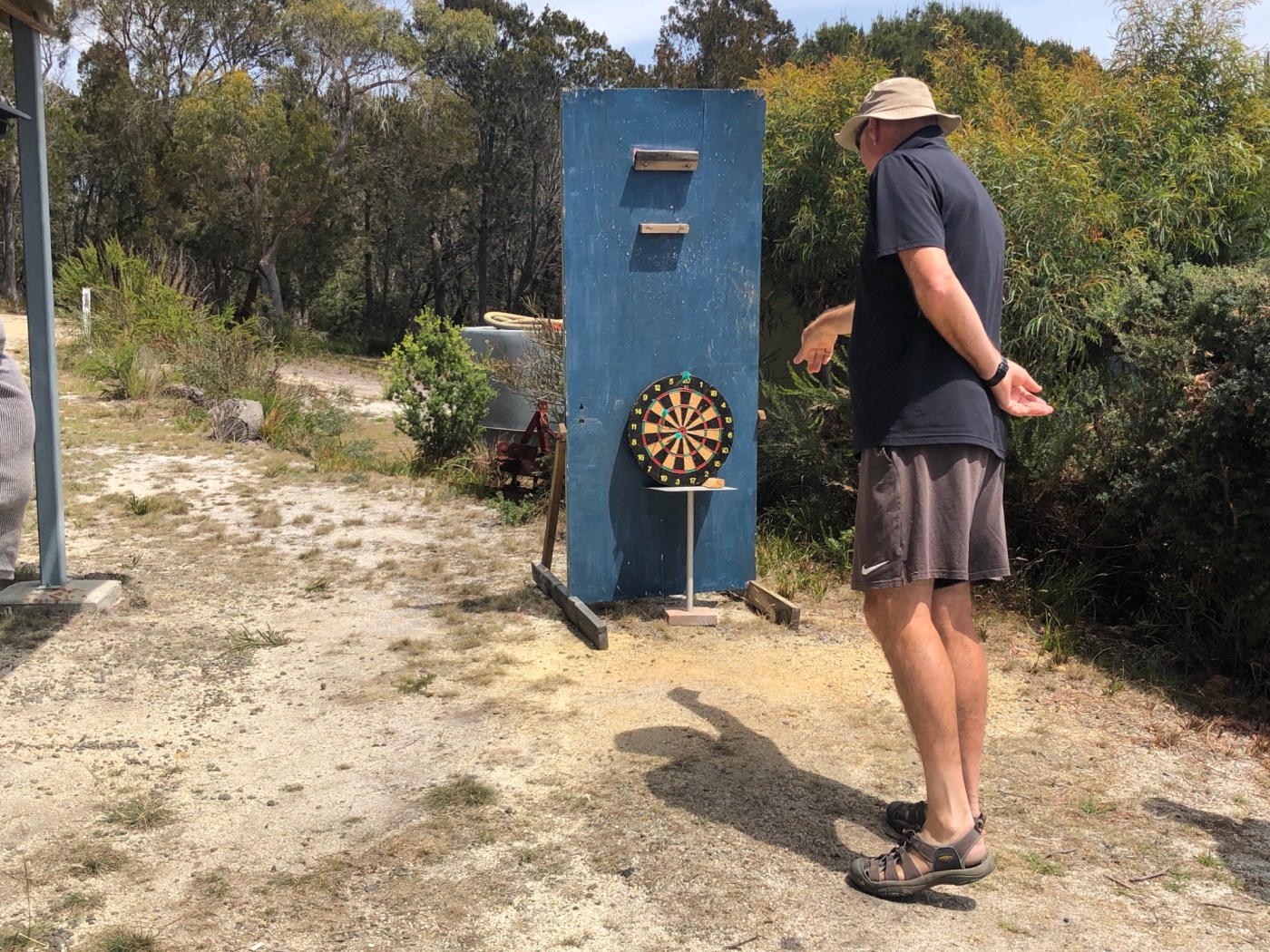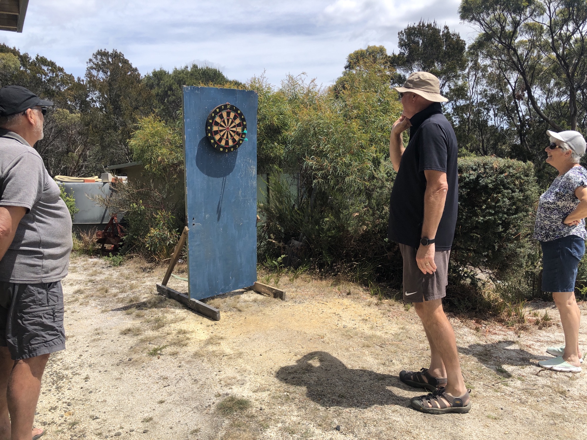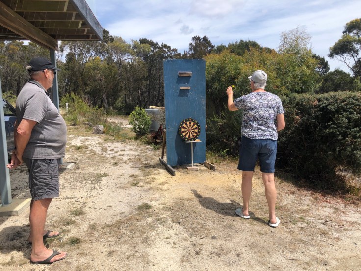 After our return to the shack, a shower and a late breakfast, the sporting pursuits continued. “How about a game of darts,” suggested Len. I hadn’t played darts since I was a wee nipper, but I’ll be up for that. This was the best way to play darts…a very informal board hanging on a piece of wood outside in the sunshine. I had the game explained to me again and then it was on. Steve and I up against Len and Pauline. The experienced threesome, which did not include me, succeeded in nailing the numbers as we played ‘Around the Board’. I successfully landed the dart on the board, which was a promising start. “What numbers do I need?” I asked as I stood up for my next turn. “10, 11 and 12,” Steve told me. I stood with my toe on the line in the sand…eyed the numbers on the board…raised my dart…lined up my sights and aimed that pointy projectile towards my prize…ready…aim…throw! TEN! Well, whad-a-ya-know, I’d hit what I aimed for! OK, here goes dart number two…ready…aim…throw. ELEVEN! No way! Third and final dart…ready…aim…throw…TWELVE! “Did you see that! Did you!?” I turned to Steve, looking to receive rapturous praise for taking our team three numbers up with the mother of all beginners luck! “Did you see…?” Would you believe it, he hadn’t even stayed to see my moment of triumph! He eventually wandered back from his loo visit to find a somewhat deflated team mate. “I just hit three in a row!” I reported, “and you missed it!”