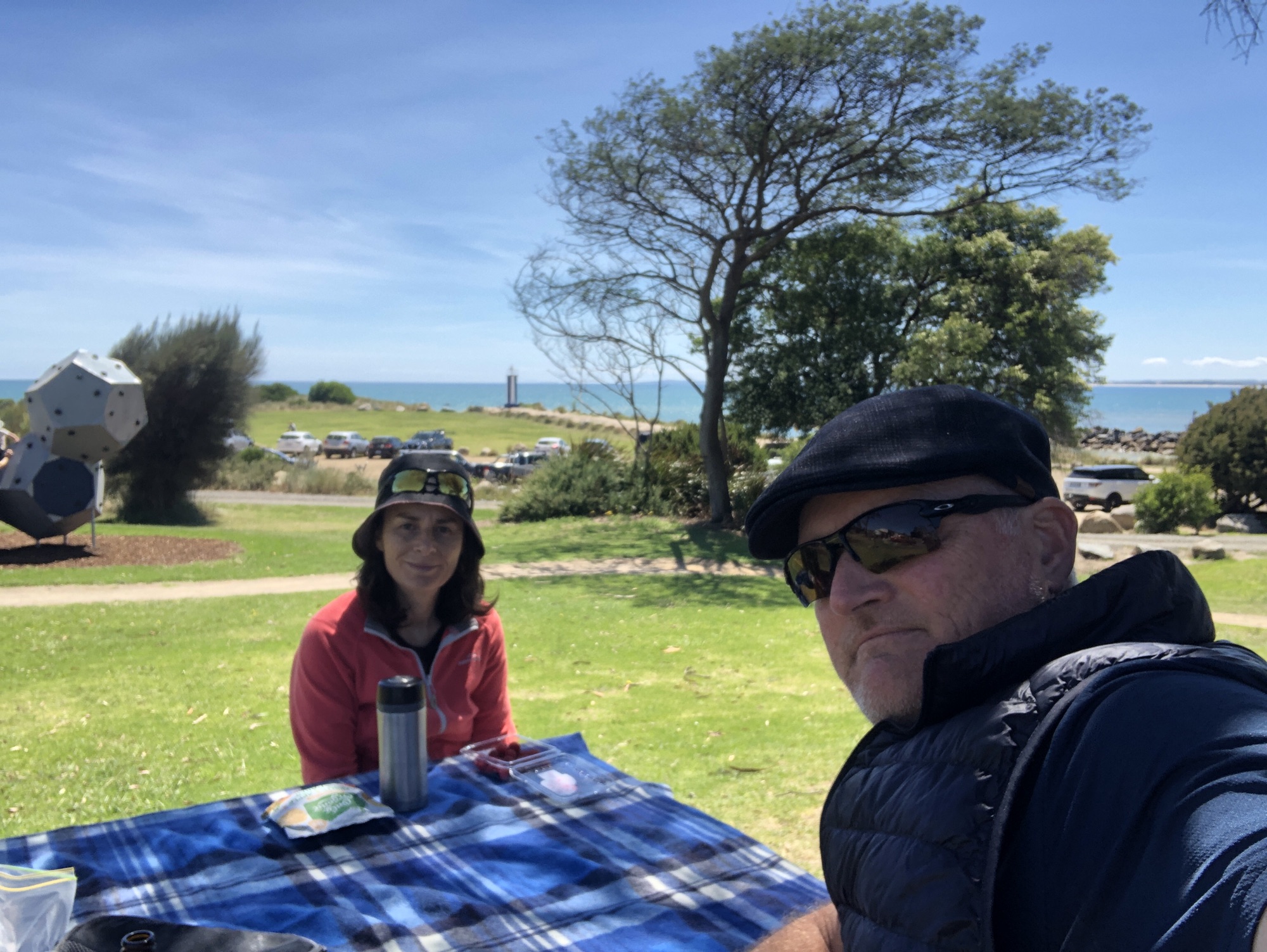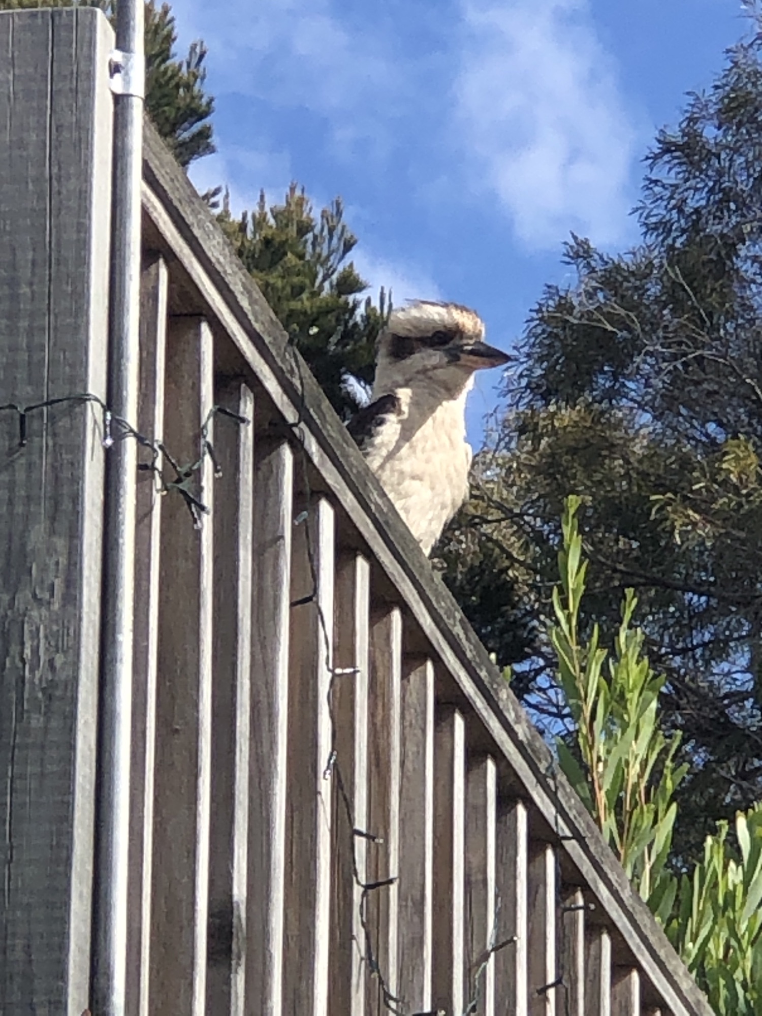 “Well done,” he offered. Mmmmm, fine. Not the same as seeing it live though. The game continued with the dart board falling down a couple of times, which didn’t stop us from playing on, we just had to adjust our sights a bit lower as we aimed for a dart board that started at head height and ended up at ankle height, but that just added to the fun and challenge. We were supervised from above by an intrigued kookaburra, glued to the high quality gamesmanship being displayed below. We won some rounds, Len and Pauline won some rounds and a bonza time was had by all. Time for a restorative and congratulatory brew.