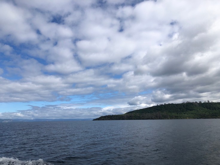 Ernest choofed across the lake and there was no danger of a hat being blown off. No high octane speeds for Ernest, just a sedate splash through the water of Lake Taupo, which happens to be a super volcano that last erupted 1800 years ago, leaving a caldera that is now the lake. Our skipper took us up to the carvings that stand 14 metres high and we bobbed and swayed in the waves as photos were taken.