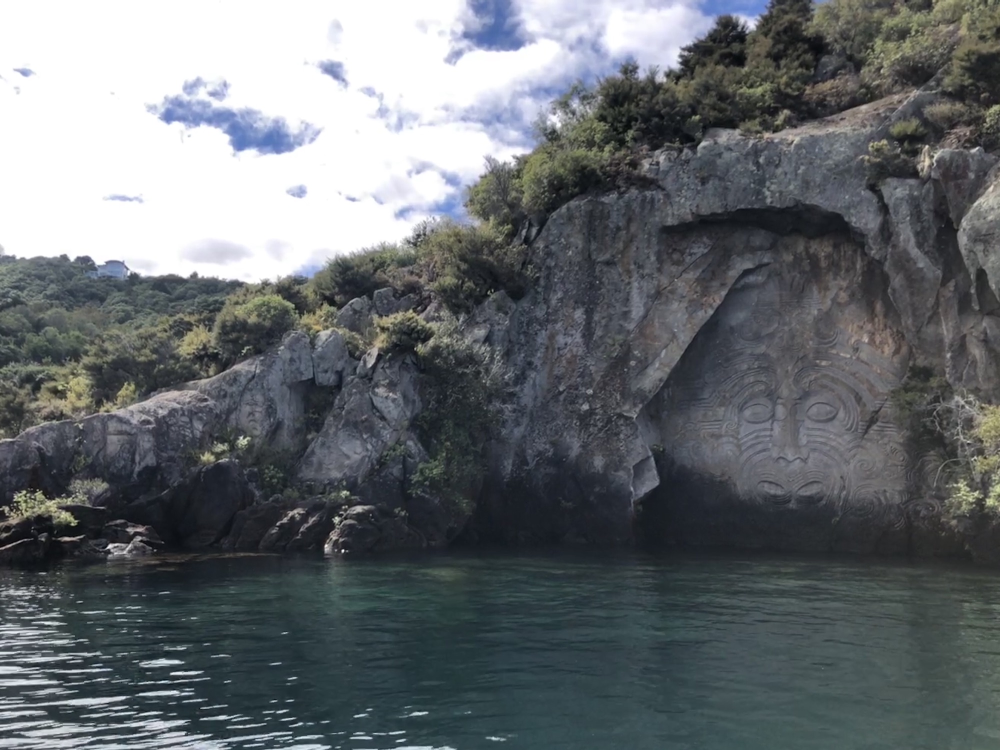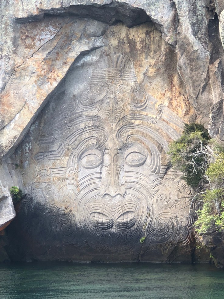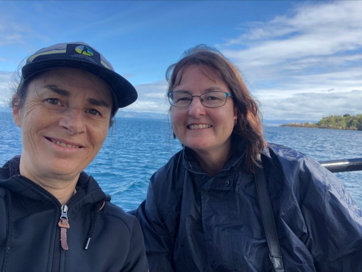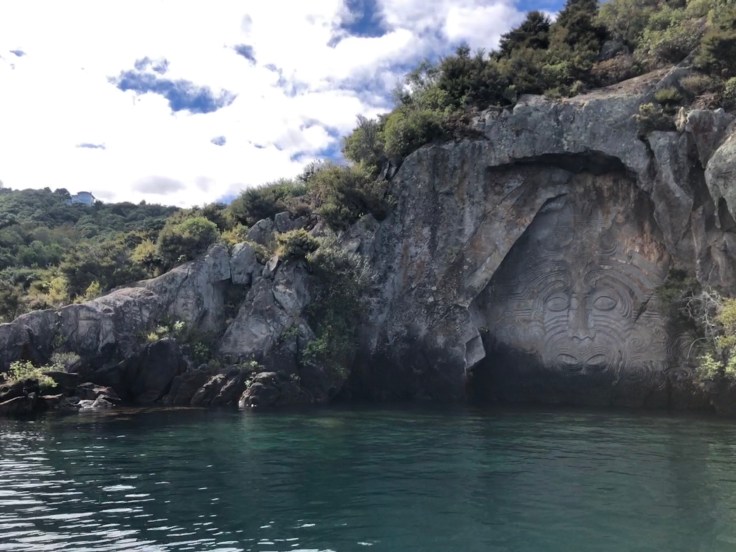 Run done, we organised ourselves, checked out and headed down to the lake for our morning activity…a two hour cruise up the lake to see some Maori carvings. Our vessel for the cruise was Ernest Kemp and there it was, berthed beside another boat about to take a load of people out to the same carvings. Our neighbouring boat was a huge, upstairs downstairs cruiser. Their advertisement said their cruise included “a hot, freshly made muffin with tea and coffee.” We boarded Ernest and took our place at the rear, in the open where we had prime position for photos and could take in the lake air. Refreshments were provided with our cruise too…a plastic wrapped Arnotts biscuit and a paper cup of tea or coffee. We had some commentary that gave us some facts about the sites we were seeing and in between these bursts of commentary we had music playing. This could only be described as the “easy listening” variety…some Paul Simon and a bit of Phil Collins. I smiled. It was all somehow quaintly perfect! We had a boat with character, not a fancy schmancy cruiser, we had an Arnott’s biscuit with a paper cup brew and some vintage Bowie in our ear alongside some Neil Diamond. I’ll take that retro experience over the fancy one any day! Add to that, the average age of the passengers seemed to be about 65 and it somehow felt as if we were among our peeps, those who like a quieter side of life. I could feel it was going to be a nice cruise with Ernest.