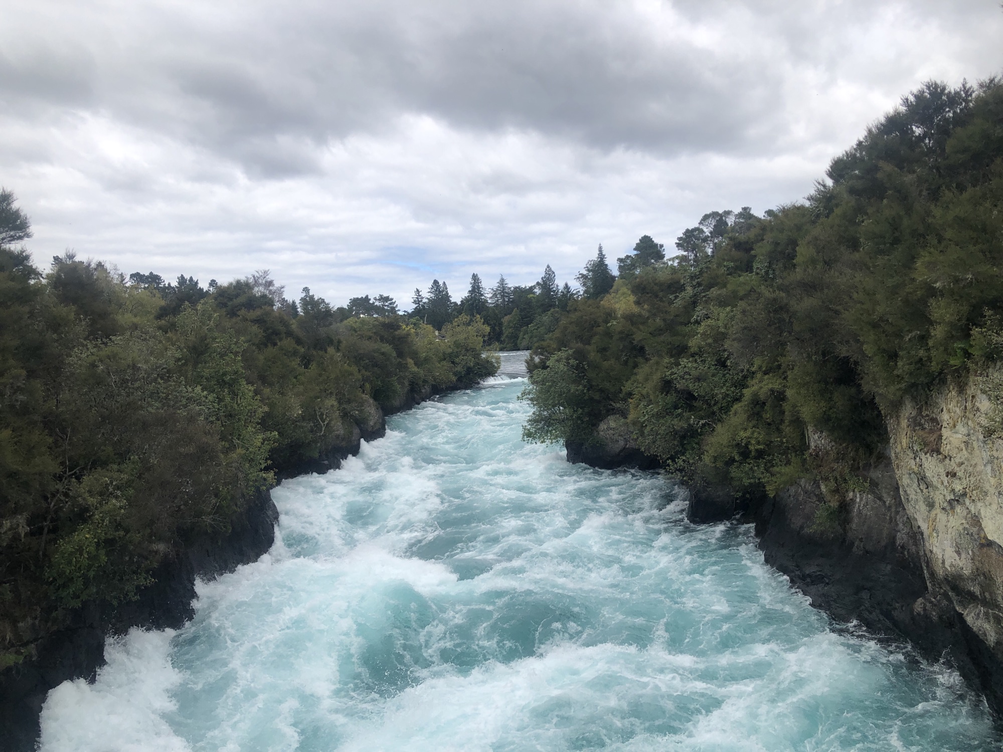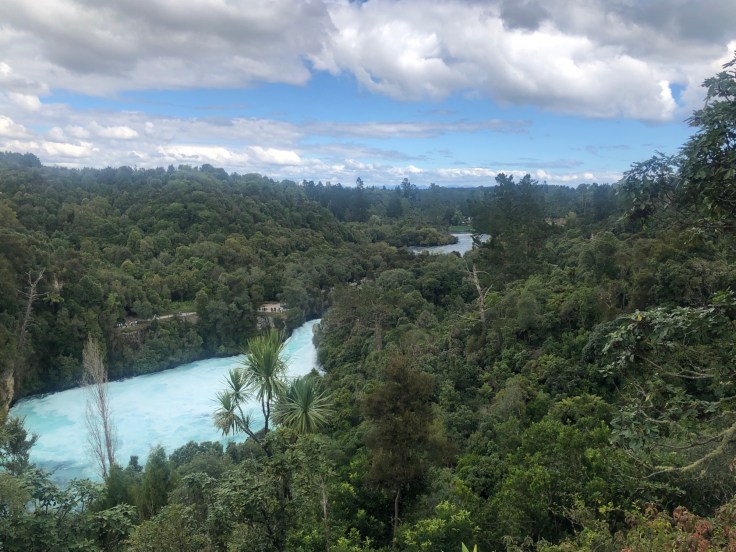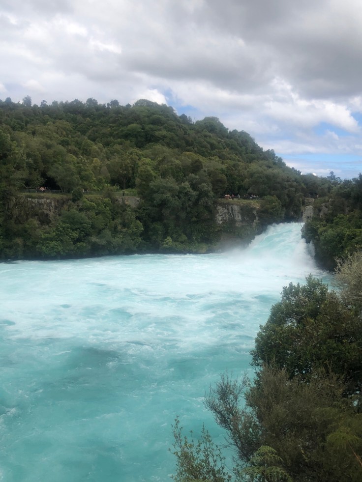 After a quick bite to eat, we motored up to Huka Falls, a stunning, rushing torrent of water with an eleven metre drop and a flow of water over the drop of 220,000 litres per second. We started at a section where we could see the river and the rushing flow of water as it roared downstream. Then we drove further up, where we could walk to a lookout near the falls. We walked down the bush track, amongst the greenery and the noise of the falls could be heard the whole way. The view was amazing and the water a spectacular clear and vibrant blue, as we stood in amazement at the ferocity of the water rushing below us. A jet boat company roared past, taking a group up to the falls, turning 360 degree turns in the raging water, sending the passengers into squeals of delight / terror as the boat tipped and plunged in the swirling torrent.