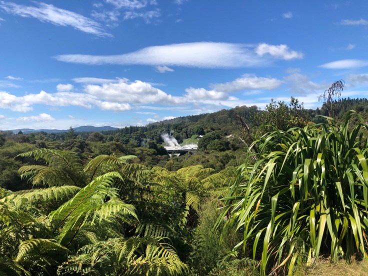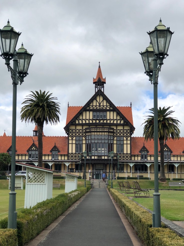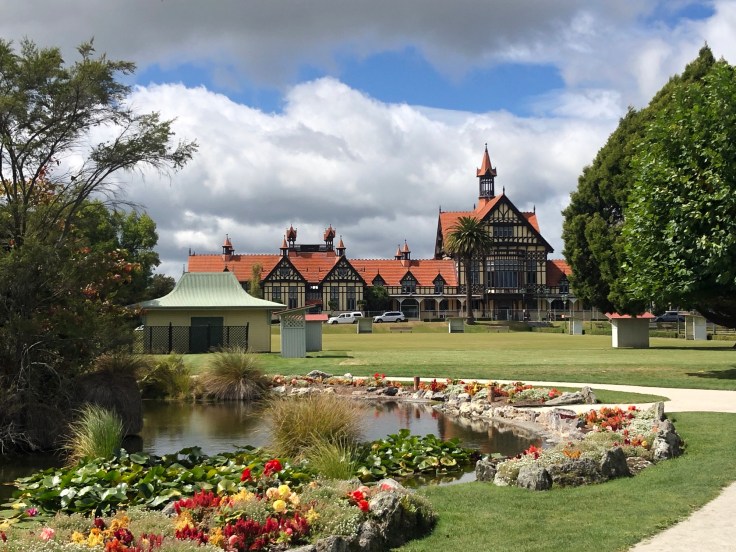 First stop when we arrived in Rotorua was the Information Centre to get our bearings and then we set off for a roam. We found ourselves down by the waters of Lake Rotorua, watching a float plane taking off and the community of ducks taking it all in their stride. Then we headed down to Government Gardens, which was a lovely spot with some fascinating architecture. The area was once a spa and the main building was the Bath House, opened in 1908 and it’s the only surviving building from the first 45 years of the Rotorua Spa. Today it’s part of the Rotorua Museum of Art and History. Nearby is the Blue Baths that were one of the first places in Rotorua where families could bathe together for fun, rather than the exclusively therapeutic spas in the gardens. The garden paths looped around croquet and pétanque lawns and also had some naturally thermal pools. The grey and showery morning had cleared to a sparkling sunny day, with blue skies and some fierce heat beating down. Just perfect for some more roaming.