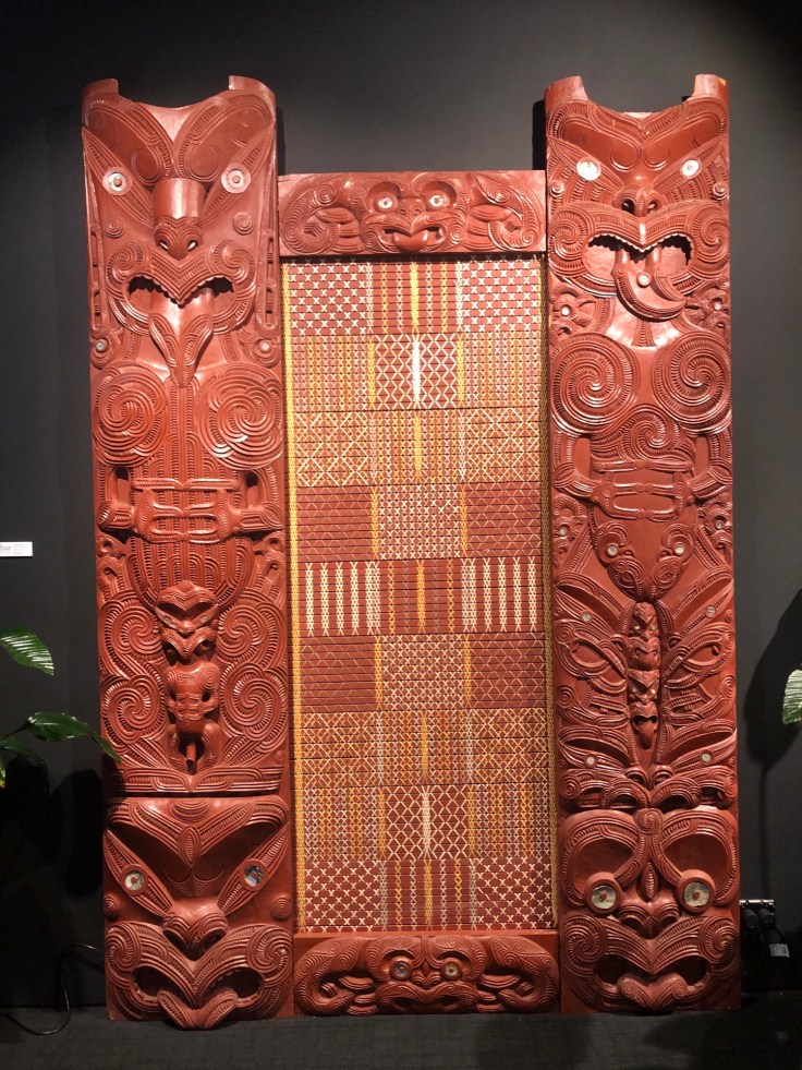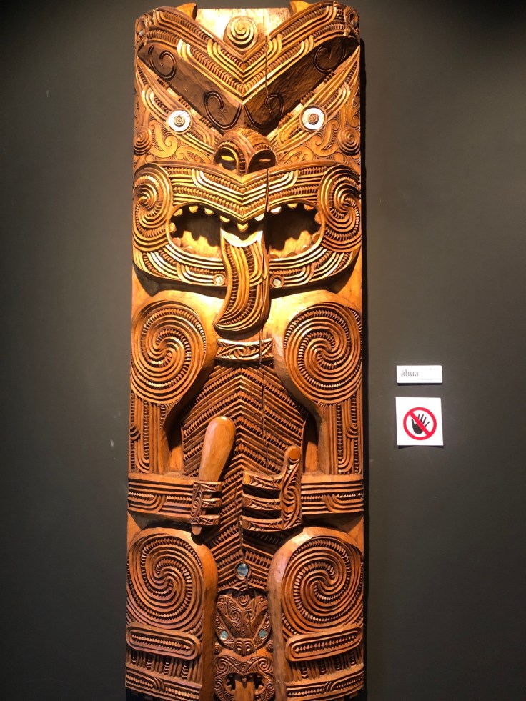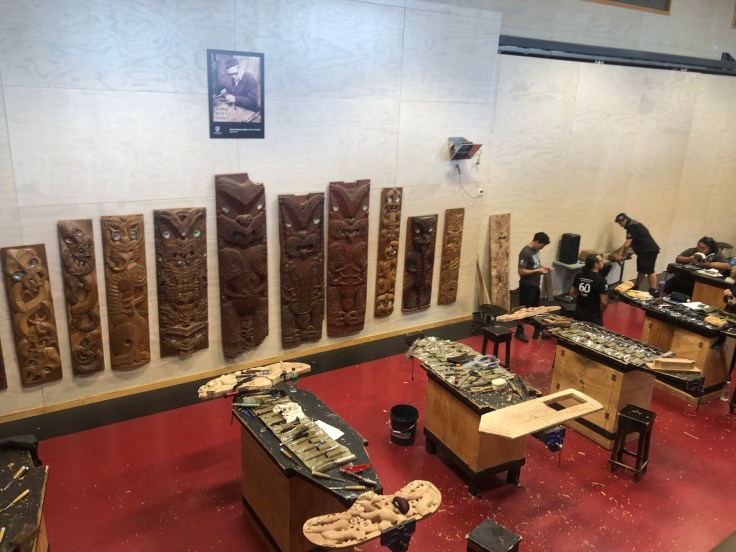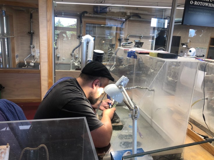 We took a walk through the Arts and Crafts Institute, where students were working away learning and practising various skills in stone, bone and wood carving and in weaving. When we saw the area where the carving is done, all the students were men. We were later told that traditionally, women are not allowed to carve because, it was explained, traditionally men would have to walk many kilometres to find a fallen tree to use and then drag this back to camp, leaving themselves open to ambush or attack from warring tribes. This was considered too much of a risk for women to do because as the saying went “if we lose a man there are more of them, but if we lose a woman we lose a generation.” Men are allowed to weave, but women are not allowed to carve. Hearing this was itching my feminist bones somewhat. We were told though, that similar schools in New Zealand do have women learning the traditional skill of carving, but Te Puia focuses on traditional approaches, although they are changing soon to open up carving to women as well. There were many stone and wood carvings around the Institute, adjacent gallery and around the park. The figures in the carvings are never of living people, only those who have died. They will often have eyes made from Pau shell (abalone shell) which is considered a “life essence” by the Maori, so including them in eyes on carvings is a way of including a life essence of the person the figure is representing.