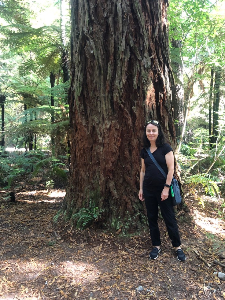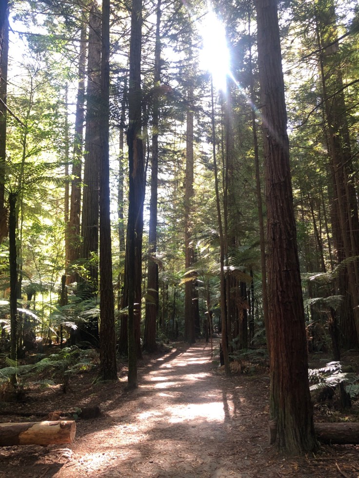 After a stroll in the Thermal Reserve under the beating sun, we took ourselves towards some shade with a stroll through The Redwoods & Whakarewarewa Forest. These amazing giants towered above us, with their bark showing the red glow their name suggests and we strolled between the broad trunks of these incredible trees.
