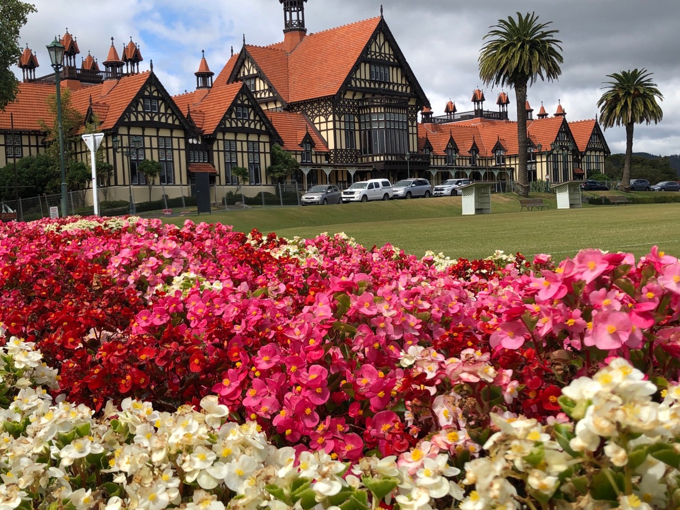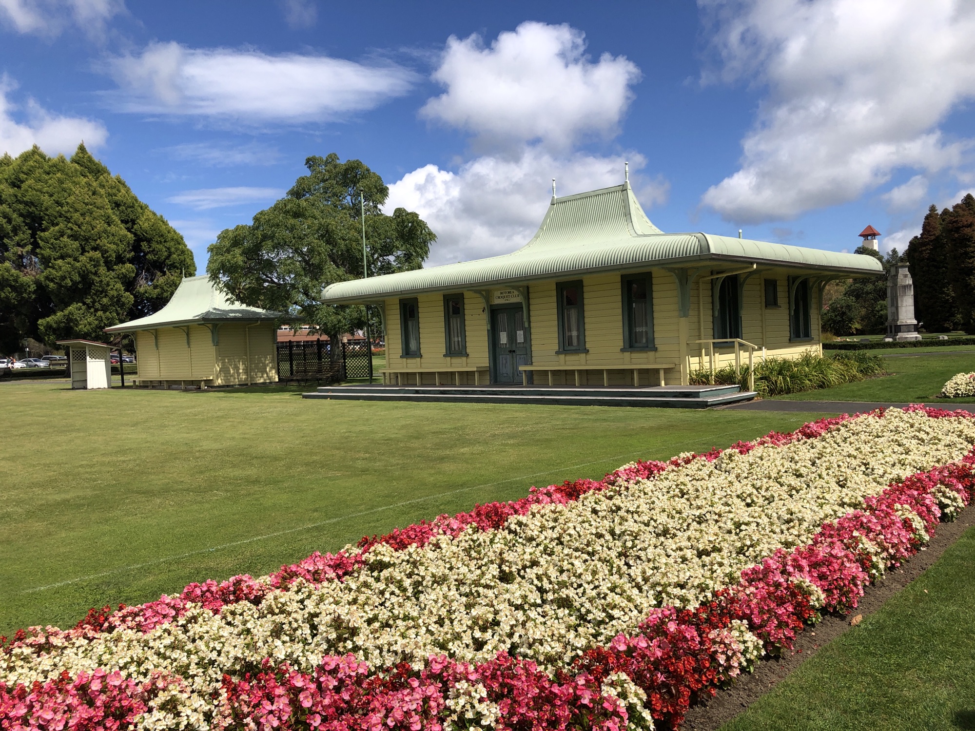 First stop when we arrived in Rotorua was the Information Centre to get our bearings and then we set off for a roam. We found ourselves down by the waters of Lake Rotorua, watching a float plane taking off and the community of ducks taking it all in their stride. Then we headed down to Government Gardens, which was a lovely spot with some fascinating architecture. The area was once a spa and the main building was the Bath House, opened in 1908 and it’s the only surviving building from the first 45 years of the Rotorua Spa. Today it’s part of the Rotorua Museum of Art and History. Nearby is the Blue Baths that were one of the first places in Rotorua where families could bathe together for fun, rather than the exclusively therapeutic spas in the gardens. The garden paths looped around croquet and pétanque lawns and also had some naturally thermal pools. The grey and showery morning had cleared to a sparkling sunny day, with blue skies and some fierce heat beating down. Just perfect for some more roaming.