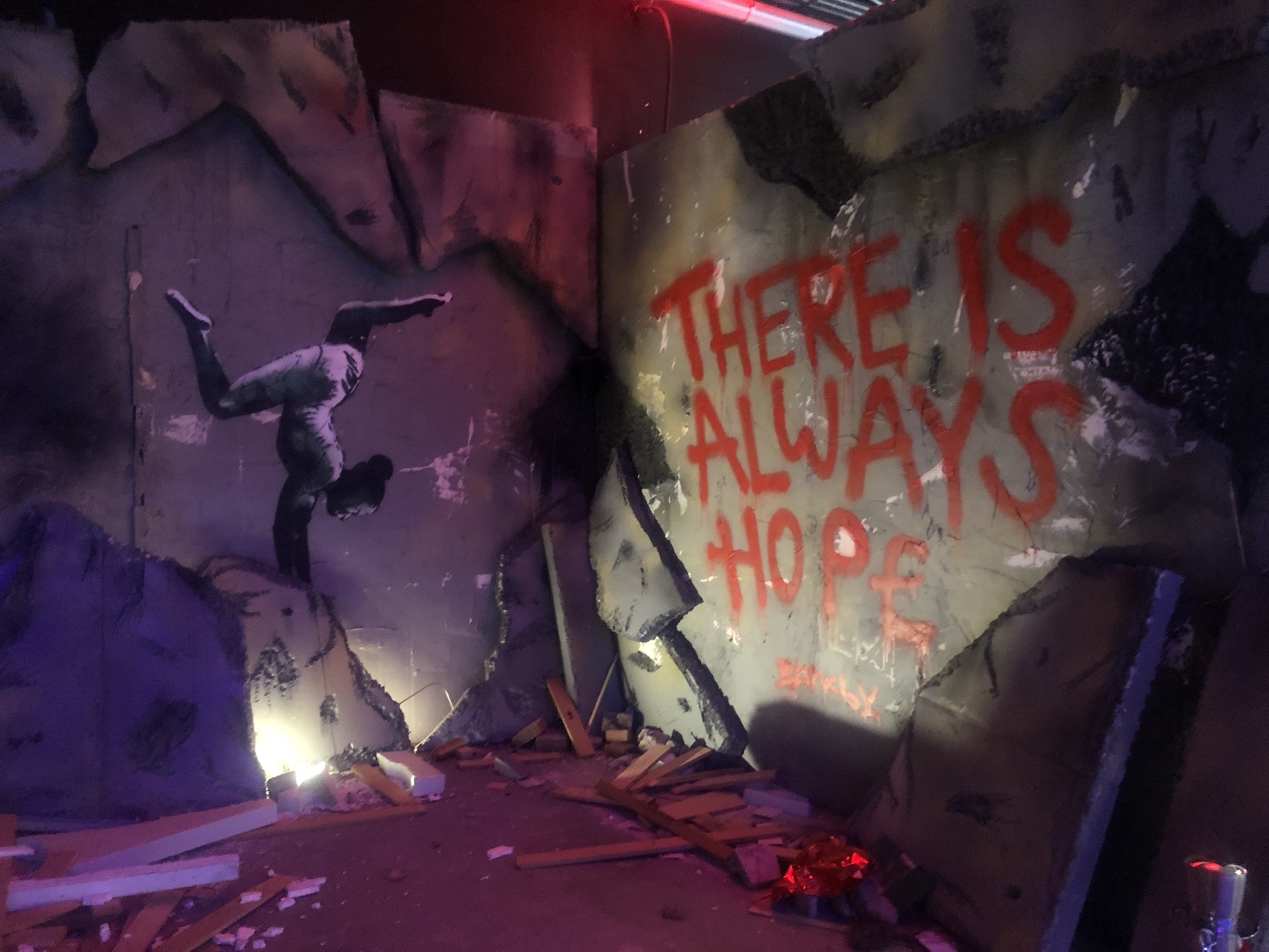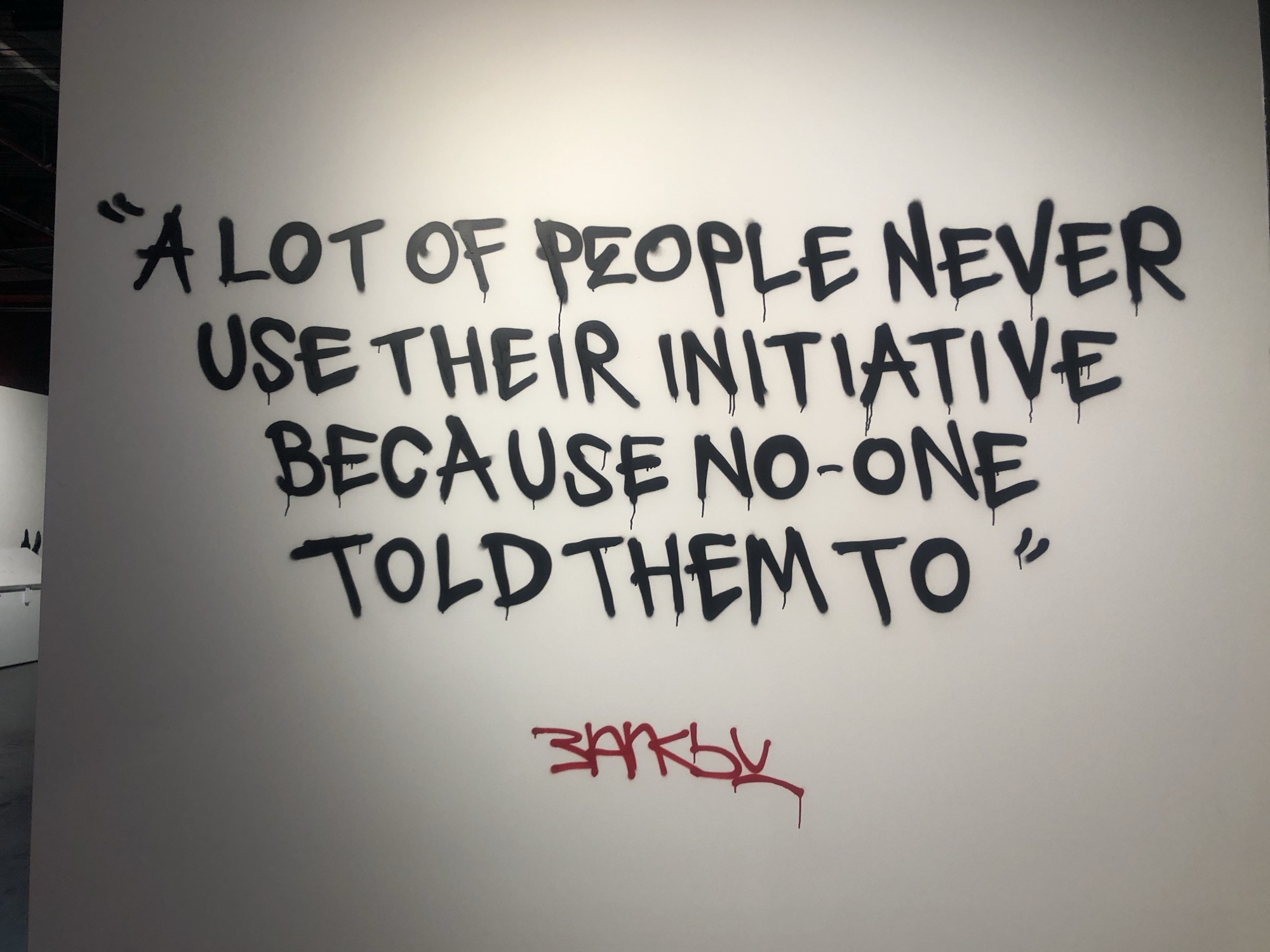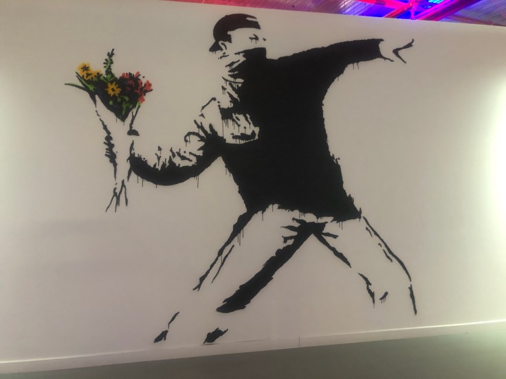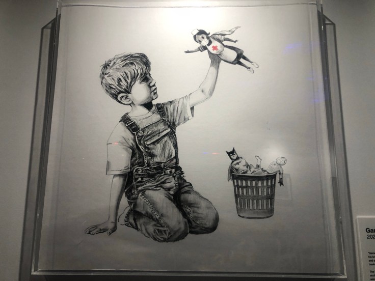 Our destination at Docklands was to visit an exhibition of the works of Banksy, the famous yet elusive street artist. I had only ever seen his work in the media and not up close, so this was terrific to be able to wander past the exhibits and really take in the powerful and necessary messages, delivered in such simple and stark technique.