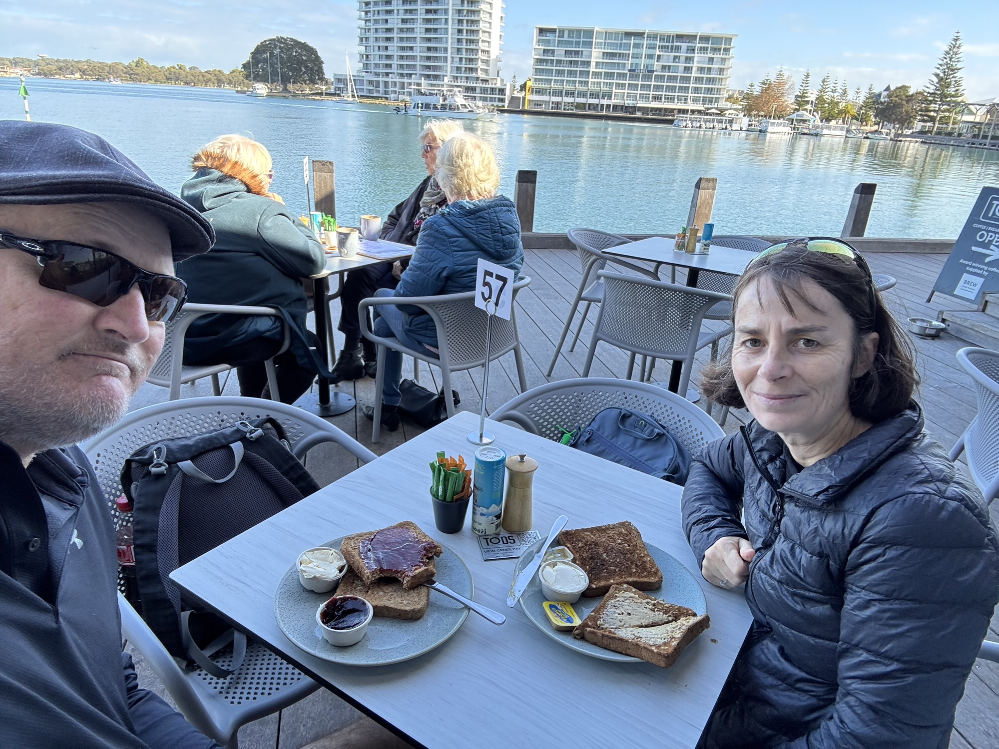 We hopped off at the Mandurah foreshore and took care of the immediate essential business, which was to have elevenses. Finding a cafe by the water, we settled in for some toasted rye and jam, and as we enjoyed our morning fare, I smiled at the couple at the next table and their companions. They had with them five little Sheltie dogs, three on leads and two were being pushed in a small dog pram. When their food arrived, the man and woman were brought their own plates with a full breakfast of bacon and eggs and also a small plate with a single sausage. Yes, they had ordered for their dogs as well and the server had placed the dogs’ sausage on the table for them with an equal measure of hospitality. Those little dogs then began the ‘stare down’ as they waited for their sausage brunch to be handed to them. It put a smile on my dial to see both two and four legged patrons duly catered for and happy with their repast!