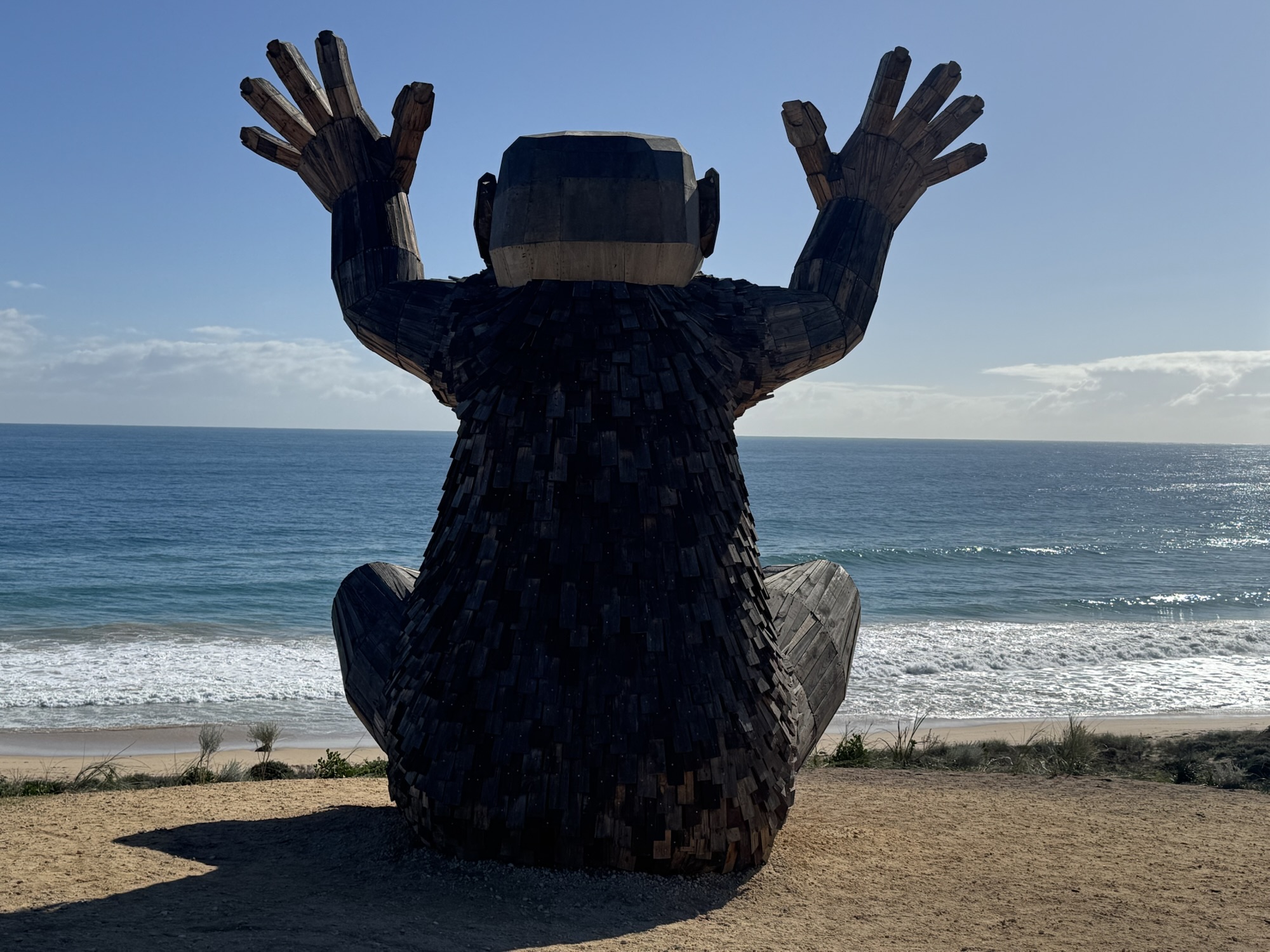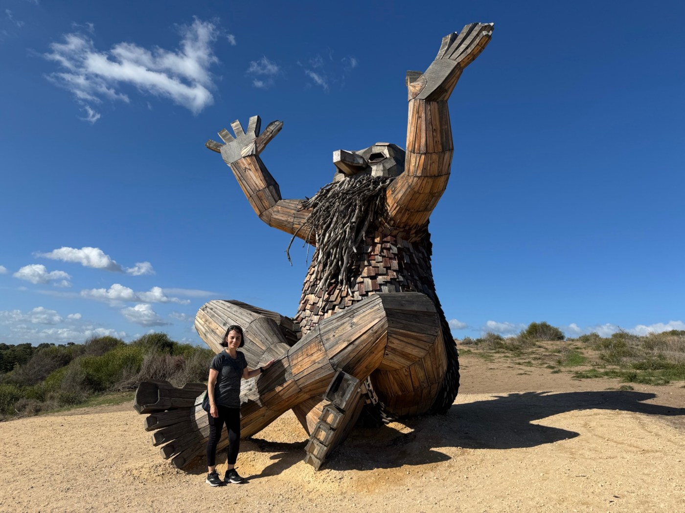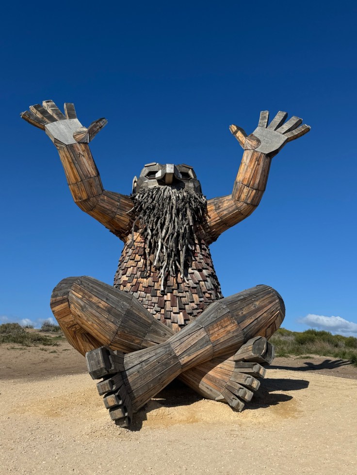Fully fuelled and ready to go, we headed for The Bike Kiosk to hire ourselves some two wheeled steeds to explore the surrounds. Do we go electric, or pure pedal power, that was the question? Nah, we’re still old school, so we opted for a couple of standard mountain bikes that required leg power alone and then set off to find one of the Giants of Mandurah. Of course, you can guess what happened next, can’t you…yep, of course we got lost! A wrong turn, followed by another wrong turn and many u-turns before we finally found the path and we were on our way. The Giants of Mandurah are created by Thomas Dambo, who makes art from recycled wood. These giants span about a 60km route along the coast, recommend to be visited by car, since they are quite spread out, but there was one within riding distance, so we set off to find him. You can have a look at the whole concept here https://visitmandurah.com/giants-of-mandurah/