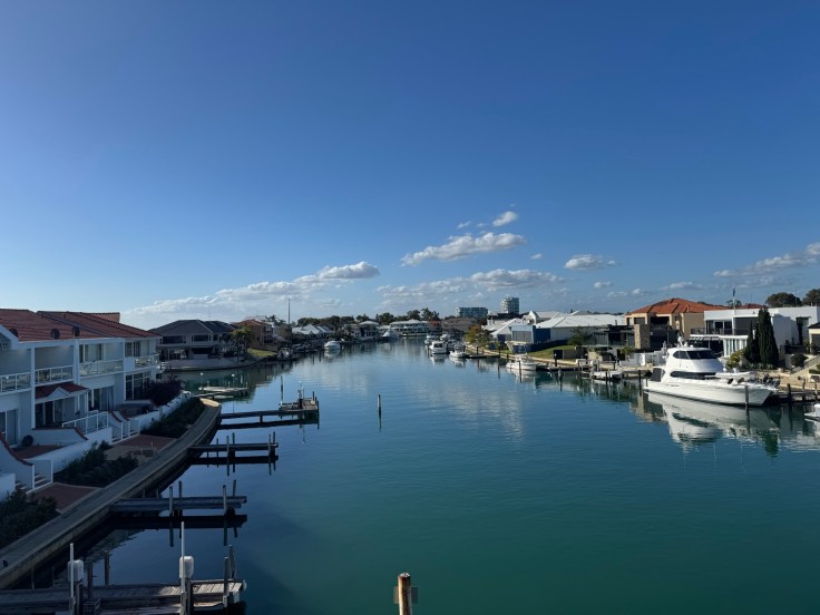 The ride back once again gave the quads a workout as we huffed and pedalled up those stingy steep slopes and then wheeled back into Mandurah. Again, we took a few wrong turns (no surprise there) and then tootled about the marina and canals. There were fancy rich houses lining the canals, most of them with a boat moored out front. Some even had two boats, a cruiser and a run-about, a bit like an aquatic version of having an SUV and a Hyundai i30 parked in the garage. Oh, how the other half live.